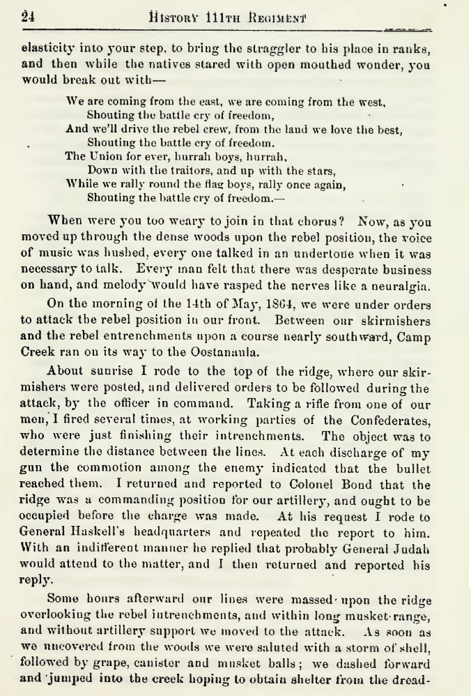 An account of the action along Camp Creek on May 14, 1864 from the 111th Ohio Volunteer Infantry...