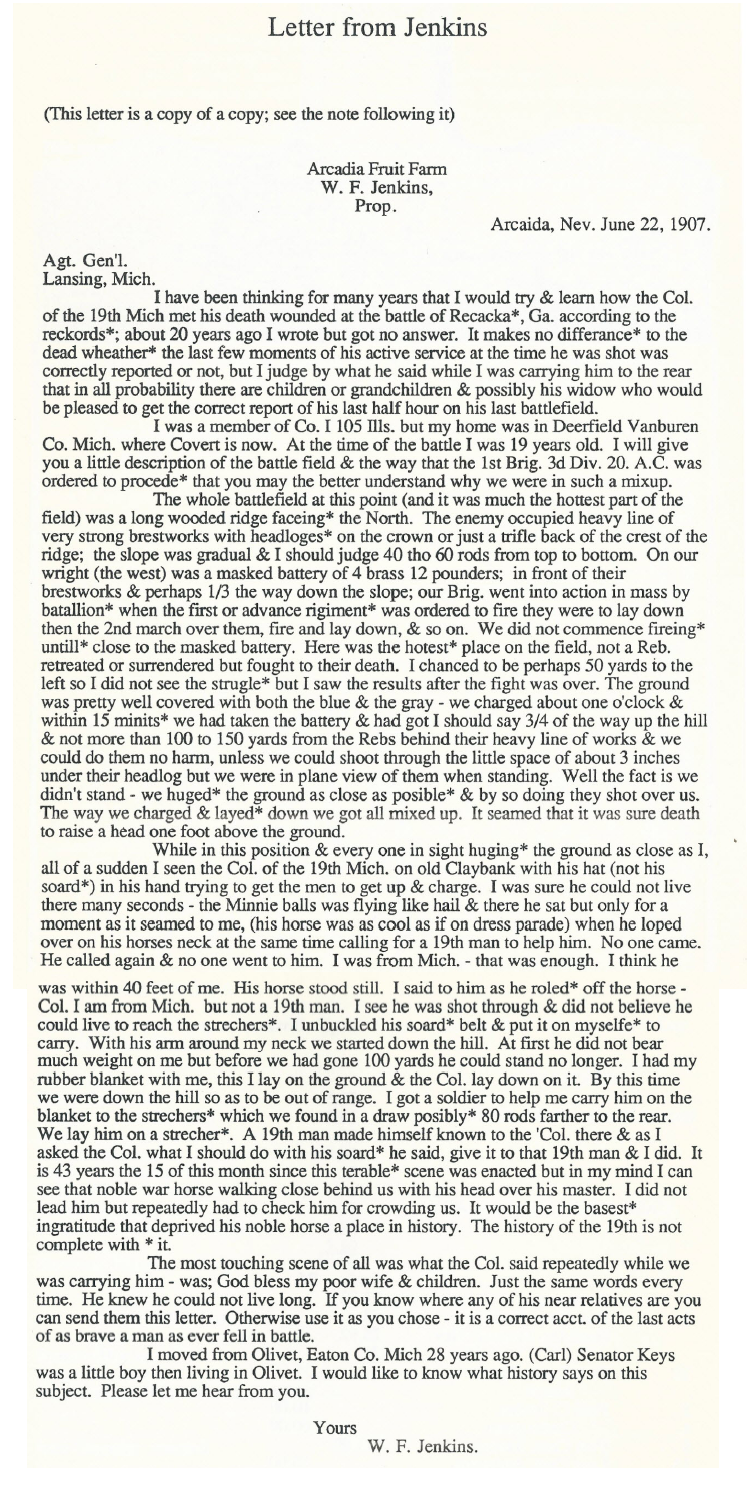 Correspondence concerning the death of Colonel Henry C. Gilbert, 19th Michigan...