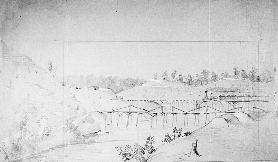 A sketch of the railroad bridge and wagon bridge at Resaca drawn by J.F.E. Hillen, May 30, 1864.