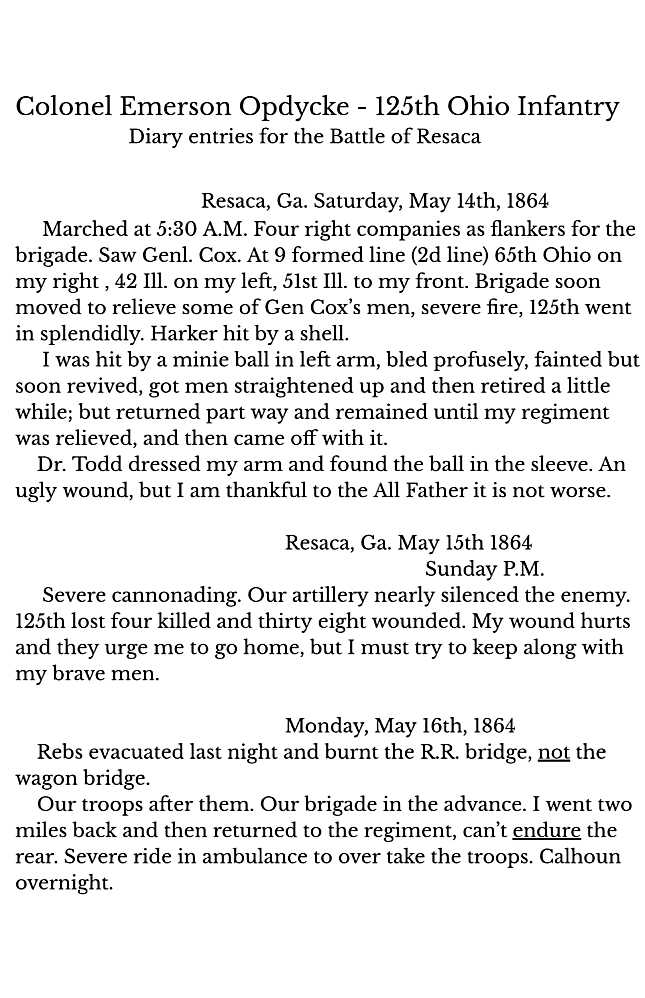 A transcript of diary entries by Colonel Emerson Opdycke pertaining to the Battle of Resaca. You will his photo on our Faces page.