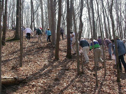 Participants of the tour make their way up an embankment in front of the Confederate lines to view some of the superbly preserved entrenchments on the Resaca Battlefield. This is the area occupied by Cheatam's Division. |