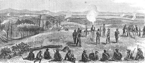 Perhaps the most significant development of the day came not from Camp Creek nor the Union left flank but along the front before Resaca proper. Polk's Corps had been skirmishing with McPherson's all day there. At 5:30 p.m. McPherson was ordered to launch a full-scale attack on Polk. This was done to prevent Polk from sending any troops northward to aid in Hood's attack or perhaps to exploit any thinning of the Southern line if the Army of Tennessee had already sent men north. A great deal more was accomplished, however, as summarized by Bill Scaife: "…Charles R. Woods' 1st Brigade pushed across the creek, the 26th Iowa Regiment in advance and the 12th Missouri Regiment protecting the flank. Woods was supported on the right by Giles A. Smith's 1st Brigade of Morgan L. Smith's 2nd Division - the with 57th Ohio, under the command of Colonel Americus V. Rice, leading the skirmishers. Encouraged by thousands of 'hurrahs' from Logan's XV Corps on the hills to their rear, Woods' and Smith's men ascended the slope and established a lodgement before dark. By daylight on May 15, Logan's troops had secured the position, while Polk reformed his Confederate line through the cemetery just west of the railroad, in the very outskirts of Resaca. Since Federal artillery could then command the railroad bridge across over the Oostanaula River, Johnston ordered a new pontoon bridge erected a mile upriver, hopefully out of range of the guns." (Scaife p. 30) He also ordered Polk to retake the hills. Three spirited Confederate assaults upon the positions, however, came to nothing. Polk's men retreated and strengthened their lines during the night. Shelling the Railroad near Resaca from Harper's Weekly. May 14 ended inconclusively. The main Federal assault of the day was badly mismanaged and soundly repulsed. Ultimately, Judah would be dismissed from command for his part in the debacle. Polk's men have been driven from key positions overlooking Resaca, threatening Johnston's ability to retreat. Meanwhile, on the northern part of the battlefield, Johnston and Hood were encouraged by the destruction wrought upon the exposed Northern left flank. Despite being unable to accomplish all that was hoped for, that evening Johnston ordered the attack be resumed the next day. Soon news would reach him that would cause him to temporarily countermand that order. (See Lay's Ferry for details.) |