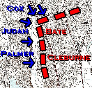 The attack was made over two very different types of terrain. Cox's front would strike around the point where Hindman's division joined Hood's Corps with Hardee's Corps at an angle precisely where the upside-down "L" in the Confederate line shifted back toward the east. Here the ground was covered heavily in brush and trees and was rolling with small hills. Judah's and Palmer's men, however, were confronted with fewer such natural obstacles until they got to an open field through the middle of which ran Camp Creek. Beyond the creek Hardee's Corps was entrenched upon a wooded ridge. Due to the nature of the terrain and to some confusion in command, the Federals hit the Southern line in a disjointed fashion, with Judah storming ahead of Palmer's and Cox's troops. This was the beginning of a bloody repulse for the Northern troops. The action is described by Brigadier General Nathaniel C. McLean, commander of Judah's first brigade: "I accordingly ordered an advance, and as well as I was able kept my men in line in passing over the troops of the Fourteenth Corps and through the dense and tangled undergrowth of the forest. We passed over one or two ridges and valleys, and at length reached a ridge, the top of which was within musket-range of the earth-works which crowned the hill fortified by the enemy. They here opened fire upon us, but my men steadily advanced, passing over a fence at the foot of the hill, when they came upon a plain exposed to the full fire of the enemy from artillery and musketry. As soon as the cleared ground was reached the whole line started forward with a tremendous shout for the rebel works. Never did men more gallantly breast the storm of death which was hurled upon them from every quarter, and their advance continued until they were broken by a bog and creek into which they plunged more than waist deep. To climb the opposite bank under such a murderous fire was more than they could do, especially when we found the works so strong that with the force then attacking there was not the slightest chance of success. Under these circumstances we were forced back, leaving fully one-third of the attacking party killed and wounded on the field. A large number of the men found protection under the banks of the creek, and from there kept up a constant fire upon the men who worked the artillery in the rebel works, and succeeded in compelling them to load their guns lying down." (O.R. No. 311) Palmer's Corps tried to offer some assistance on Judah's right, but the story was much the same. Brigadier General Richard W. Johnson's report tells of the action on that portion of the battlefield: "I found the enemy strongly posted and fortified on the hither slope and near the crest of a long, elevated ridge, their right slightly refused from the direction of my line. In front of their position was an open field of some 400 yards wide, sloping gradually down to a creek directly in my front. The general course of this creek in front of my line was nearly parallel to the enemy's works; the bottom was in some places miry with a considerable depth of water-in others quite the reverse, its crooked channel filled in some places with a dense underbrush in others obstructed by fallen trees and drift. If afforded a serious obstacle to the advance of troops in line, as the result proved, as the land rose immediately from the creek in an abrupt bluff of nearly the same height as the enemy's position beyond, and then gradually sloped down again to the westward. With my skirmishers posted along the creek, I reformed my lines in the woods behind the slope, to the rear of it, and awaited instructions. At about 11 a. m. I received notice front the major-general commanding corps that as soon as the left should get into position an assault would be made along the whole line. I was ordered to advance as soon as by the firing I should be warned of the movement of the troops on my immediate left. Accordingly, about 11.30, heavy firing on the lines of Baird's division indicating that his troops were advancing, my two brigades in the line moved forward, Scribner's having already, in anticipation of the movement, been brought up into close supporting distance. General Carlin, who lay very near the creek mentioned, threw forward his skirmishers, driving those of the enemy within their works, and moved forward his lines across the creek. No sooner had his first line emerged from the cover of the woods than the enemy--infantry and artillery--opened upon it with terrible effect. Notwithstanding this, however, Carlin pushed forward both lines beyond the creek and nearly half way across the open field. The passage of the creek had, however, sadly disordered his lines, and finding it impossible to reform them while advancing so rapidly as the emergency of occasion required, hopeless, moreover, of holding his position even if the assault should succeed, Carlin fell back to the cover of the creek, the eastern bank of which offered in some places all the protection of a well-constructed fortification. Here he remained, by my direction, all day, keeping up a desultory but effective fire in reply to the enemy's. King's brigade, which lay considerably farther from the creek than Carlin's, did not advance so far, and, when it was seen that Carlin had suffered a repulse, halted. Two 12-pounder guns of the enemy's in my front had opened upon our advance, and continued their fire subsequently, at intervals, with damaging effect. As soon as a practicable road could be found I brought forward two pieces of Captain Dilger's battery, I, First Ohio Light Artillery, and caused them to be placed in position on the crest of the bluff overlooking the creek and near my center. The admirable practice of this section, conducted under the supervision of Captain Dilger in person, soon closed out the enemy's pieces, and was quite as annoying to them as theirs had been before to us. More than once their infantry, driven from their works by Dil