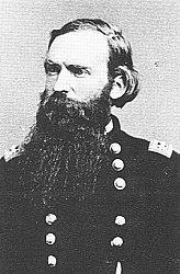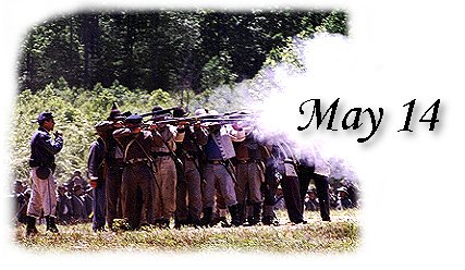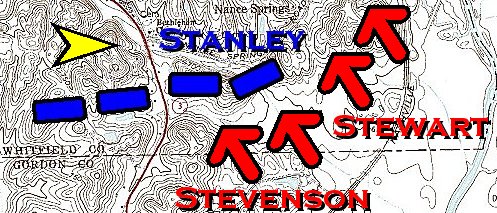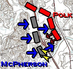 It was more difficult for Bate's men, especially on the portion of the line held by the famous "Orphan Brigade." This veteran unit was so named because it was composed of Confederate regiments raised in Kentucky early in the war. Since Union forces controlled their state for practically the entire war the troops felt themselves "orphaned." These men served as the "point" of the angle of the Confederate line as it shifted from along Camp Creek back to the east. This meant that this brigade was not only faced with Judah's assault, but that of Cox's division as well. After repulsing Judah, the fighting intensified against Cox. A history of the brigade tells the story: "The Federals attacked repeatedly. 'Column after column came down in full view, and moved right toward us,' wrote an Orphan. Some of the enemy got within seventy-five yards of their line before (the brigade) opened up. 'It was harvest time with the Orphan Brigade,' said one, 'and every available contrivance was used for reaping the field before us. The fighting became so intense that when John Gordon of Company D, 4th Kentucky, fell dead, his comrades spent the rest of the day stepping over him in the melee. Only with nightfall could someone find time to take him from his place in the line. The new corps of sharpshooters operated…somewhat in advance. 'Their terrible rifles soon attracted the fury of the Federal artillerymen,' wrote an Orphan of the 4th. Before the day was out, half of the elite marksmen lay dead or wounded. Yet others, in the midst of this terrible holocaust, found time to admire pityingly a little kitten caught between the battle lines and crying in its terror. Finally, (a gunner) jumped the earthworks and ran forward to grasp the cat and return it safely. Thereafter the tortoise tabby was a familiar sight perched on his friend the gunner's shoulder or astride a caisson. In honor of the occasion the Orphans named it 'Resaca'." (Davis, 217-218) Cox's division, supported by two divisions of Howard's IV Corps (just arriving from Dalton), assailed Bate's and Hindman. Their attacked was delayed due to the nature of the terrain on that portion of the battlefield and to the fact that Howard's Corps was late in getting ready for battle. By the time this portion of the Union assault got moving, Judah and Palmer were already repulsed at Camp Creek. This allowed the Confederates to concentrate their fire, in spite of the Federal's terrific artillery barrage, against Cox as is evidenced in Cox's official report: "The skirmish line of the division already occupied the edge of the wooded land across the open valley, some 200 yards wide, immediately in our front, when the command to advance was given and the whole division moved steadily forward, the enemy opening immediately with artillery from batteries in position down the valley on our right, and which had an oblique fire upon our lines as we passed through the low ground. After crossing the open we passed over several wooded ridges in succession, and through a deep though narrow channel of the creek, which, with its perpendicular sides, skirted by a tangled thicket, became a serious obstacle to the advancing troops. The lines were quickly reformed after passing the brook and again moved forward, steadily driving the enemy's skirmishers backward toward their works. These skirmishers were so strongly re-enforced that they were only to be driven back by the main line of our troops, who advanced, making an occasional momentary halt to deliver their fire. A short halt was made, bayonets were fixed, and the whole command charged the hill and carried the line of rifle-pits on the crest, driving the enemy back upon a second line some 250 yards from the first on our left, but approaching much nearer on our right. The first line of the Second Brigade was first in entering the works, but these were almost instantly entered by the First Brigade also farther to the left. The enemy immediately opened with both artillery and musketry from their second line, which extended far beyond both flanks of the division, and no troops being as yet in position on either our right or left, the division was halted, the Second Brigade (Manson's) occupying the enemy's works with their first line, and the First Brigade (Reilly's) occupying them with the second line, advancing the first line to the protection of a small intervening ridge between them and the new line occupied by the rebels, from which they were able to silence with their rifles a battery which was playing destructively upon the Second Brigade. No artillery had been able to accompany the division in its advance to attack, the broken nature of the ground and the physical obstacles of the creeks and thickets entirely preventing. The continuous heavy fire of the enemy caused, however, a considerable loss in both the One hundred and third Ohio and Fifth Tennessee while advancing to their position. An hour later I reported the ammunition of the whole division us being almost exhausted, and it being impossible to get wagons forward to the lines held by the command, I was notified that we would be relieved by the Fourth Corps and withdrawn temporarily to enable us to replenish the cartridge-boxes. A little after 3 p. m. General Harker's brigade, of Stanley's division, Fourth Corps, advanced under a galling fire of all arms to relieve the Second Brigade, and while preparing to effect the change Brigadier-General Manson was severely injured by concussion of a shell exploding near him, and was carried off the field." (OR No. 351) Cox officially reported his losses in the attack as 562 killed, wounded, and captured. Judah's division lost over 700 men. So, the Union forces sustained more than 1,300 casualties (counting those of Palmer's and Howard's supporting corps) in about two hours of fighting. With this repulse, Johnston began to turn his thoughts toward possibly taking the offensive himself with the idea of cutting Sherman's entire force 