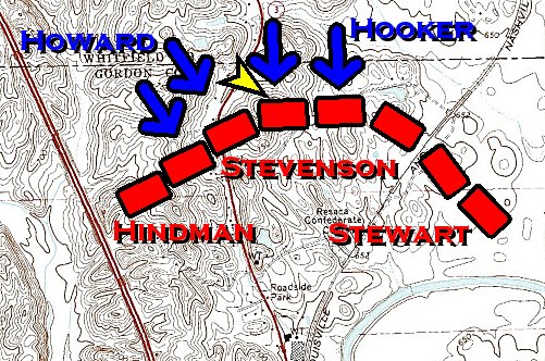 The final day of the Battle of Resaca dawned with both sides intending to attack on the north end of the battlefield. Johnston hesitated, however, pending word on whether or not Sherman had outflanked him at Lay's Ferry. Johnston reissued orders for Hood to attack about noon, augmented by a brigade each from Polk's and Hardee's Corps (Secrist, p. 47). Before these orders could be acted upon, however, Sherman sent in Hooker XX Corps and Howard's IV Corps against Hood's Corps.The rest of the battlefield would remain quite except for occasional skirmishing and exchanges of artillery. The Union plan was to drive the Confederate line southward toward Resaca while McPherson and Thomas pinned the Southerners before them in place. The hope was to turn the Confederate position and destroy the army against the Oostanaula River. Howard's troops began the assault around 1 p.m. They attacked Hindman's division whose left flank had been tested in a portion of the previous day's attack. According to historian Albert Castel: "Three of Howard's brigades 'leap' their works and advance toward Hindman's Division which holds a hill just beyond the road at a point where it curves slightly to the northeast. Immediately, to quote Brigadier General William B. Hazen, the commander of one of the brigades, 'a concentrated fire of great violence' hits them. One-hundred and twenty of Hazen's men go down in thirty seconds, and he orders the rest to return to their fortifications." (Castel, p. 173) Howard's initial attack failed in spite of a massive barrage throughout the morning by Federal artillery to "soften up" the Confederate position. The fire must have been extremely galling because it led the Confederates to make a momentous decision. Hood, in an attempt to offer some relief to Hindman's men with counterbattery fire, ordered Captain Max Van Den Corput's Cherokee Artillery battery be placed in advance of the Southern lines.