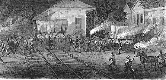 Those guns were still trapped between the armies, however, as dusk settled upon the battlefield, their fate very much in doubt. General Geary's official report describes in detail how the guns were finally captured in spite of the counterattack that was eventually launched by Stevenson's division in support of Stewart: "In the isolated position held by Cobham it was impossible to erect even a slight barricade without receiving a terrible fire from the enemy fifty yards distant. In front of my left and Williams' right was a long, cleared field occupying two hills and a narrow ravine, and extending to a wooded hill on which was the enemy's main line. In front of my right was a field occupying a long, wide ravine, extending from the right of my line to a cleared hill on which was also the enemy's main line. Through this ravine ran the road previously referred to. Across the ravine to my right were lines of intrenchments held by the Fourth Corps and facing nearly eastward at right angles to my front. In front of the center of my main line a series of timbered spurs and knobs extended half a mile toward the enemy's main lines to the detached position held by Cobham. The troops sent to his support by me were so disposed as to hold his flank as well as possible. The only route of communication with him was by way of these timbered ridges, which were swept in most places by musketry and artillery fire from the enemy's main lines. About 5 p. m. the enemy (Stevenson's division) debouched from the woods in front of my left and General Williams' right, and charged in column with the effort to gain possession of the ridges in our front. The attempt, if successful, would have exposed Cobham to attack from every side and have forced him to abandon his position, but the enemy's attack, though a spirited one, failed. A tremendous fire concentrated on him from the lines of my division and those of General Williams' almost destroyed his leading regiments (of Brown's rebel brigade) and sent the attacking column back in confusion to their intrenchments, after half an hour of sharp fighting. In this affair the artillery on both sides took an active part, canister and shrapnel being principally used. During the engagement Colonel Ireland was wounded by a piece of shell, and the command of his brigade devolved upon Colonel Cobham. That officer being already intrusted with the command of six regiments and the special work of securing the battery in his front, I directed Col. William Rickards, commanding Twenty-ninth Pennsylvania Volunteers, to assume command of such regiments as remained in the main line. Wheeler's battery had taken position in my line behind log works constructed for the purpose. About dusk Colonel Cobham reported to me in person and received instructions to dig through the works in front of the guns and bring them off with drag-ropes during the night. The necessary tools and ropes were sent out and the work performed with alacrity and tact by the officers and men under his immediate supervision. In the darkness of the night the men crept silently on hands and knees to the little fort and carefully removed the logs, earth-works, and stones in front of the four guns. At midnight all was ready. The drag-ropes were attached and manned; a line of brave men lay with pieces aimed at the crest of the hill, and at one effort the guns were drawn out and taken rattling down the hill. The enemy on the alert, sprang over their breast-works and furiously attacked Cobham's line. The sharp musketry fire aroused all our troops. Those in the intrenchments to our right across the ravine, not knowing the meaning of it, evidently believed it to be an attack upon their main line, and opened a tremendous musketry fire, much of which poured into Cobham's lines from his right and rear. Word was quickly sent themand their firing was stopped. Cobham held his position, drove back the enemy, and sent the guns, four 12-pounder brass pieces, to my headquarters." (OR No. 204) Note: This report often refers to the brigade of Colonel George A. Cobham, Jr. With his position flanked (see LAY'S FERRY), Johnston had little choice but to pull out of Resaca. He did so skillfully, leaving absolutely nothing of value for the Union troops behind but for his lost battery. (Scaife, p. 37) About 3:30 a.m. on May 16, the Confederates set fire to the bridge, thus destroying what Union artillery could not from a distance throughout the course of May 15. It was with a heavy heart that the Army of Tennessee abandoned the strong position it held at Resaca. Colonel Robert P. McKelvaine of the 24th Mississippi was part of Hindman's divison that had defended against fierce Federal attacks on both May 14 and 15. He closed his official report on Resaca with these words: "At about 10 p. m. on this day we moved out of our trenches and began our retreat from the blood-dyed hills of Resaca, and not a heart but heaved a sigh of regret at abandoning a spot where we had struggled so hard for thirty-six hours for our common country's cause-a spot consecrated by the life-blood of so many of the best and bravest of our comrades in arms; but as we looked for the last time upon their graves, and knew that the vandal foe would tread upon them on to-morrow, [we felt] that they had not fallen in vain." The fury of the Confederate resistance at Resaca made a profound impression upon Sherman's mind throughout the rest of the campaign. It would be five long weeks before the Union commander would try another major assault upon any entrenched Southern positions. The nature of the War Between the States had changed forever. It was now a matter of trench warfare that the rest of the world would not come to understand until some 50 years later in Europe. Wagon Train Passing Resaca at Night by A. R. Waud |