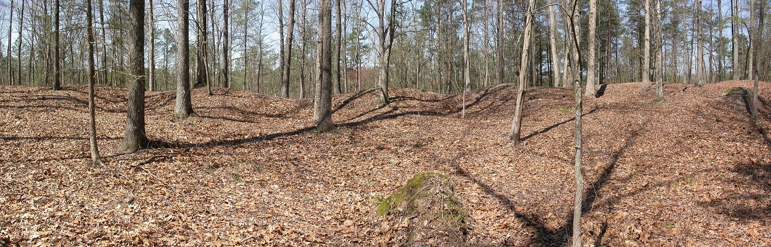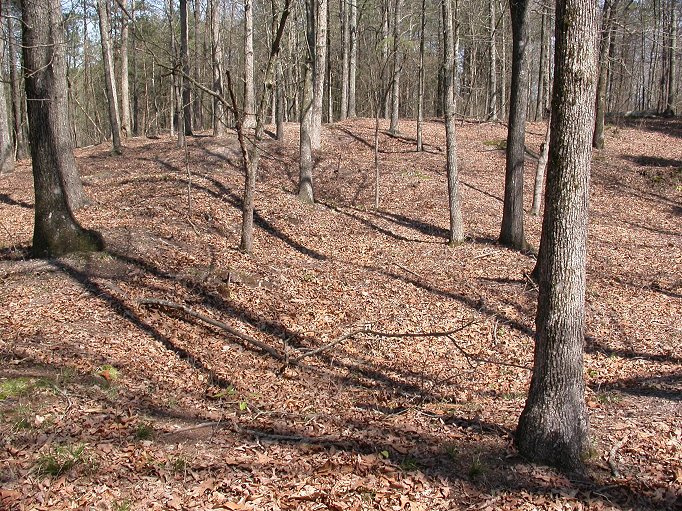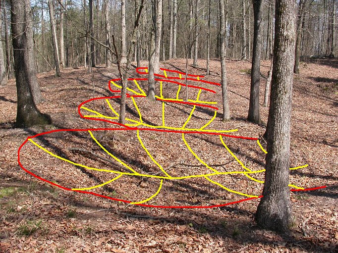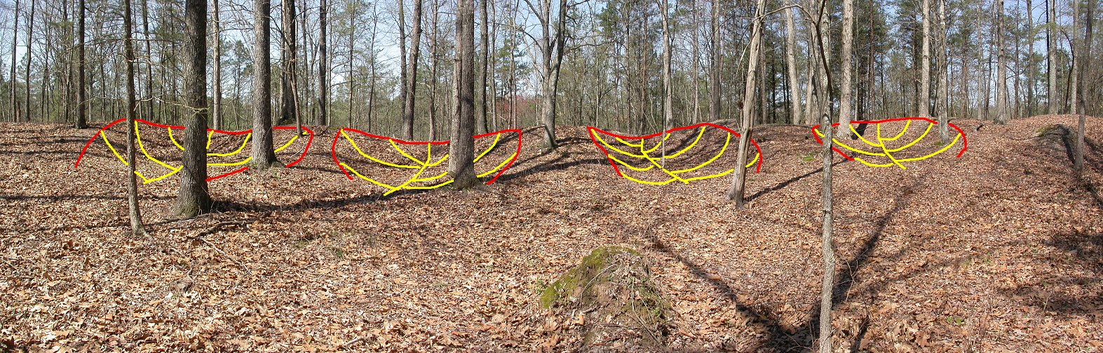 FACING EAST: Same photo as above annotated to indicate the four earthen pits remaining today of the original fortified works. Each gun position is about three feet deep in front and tapers off level to the ground in the rear. |